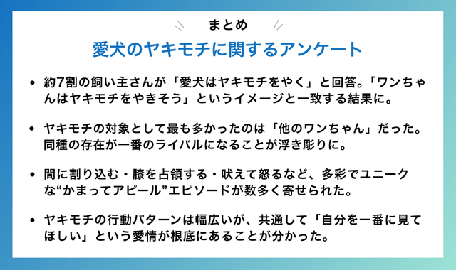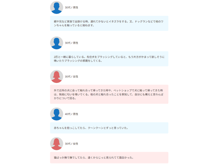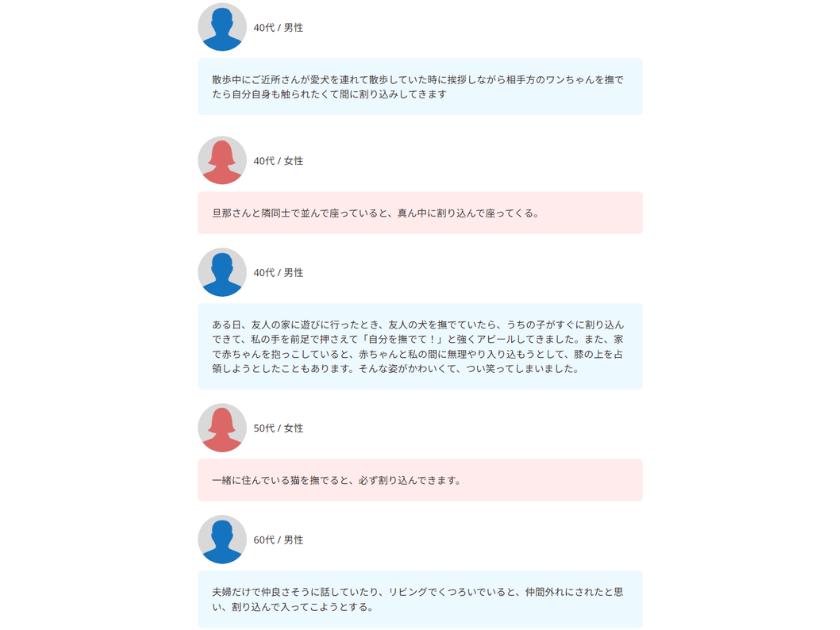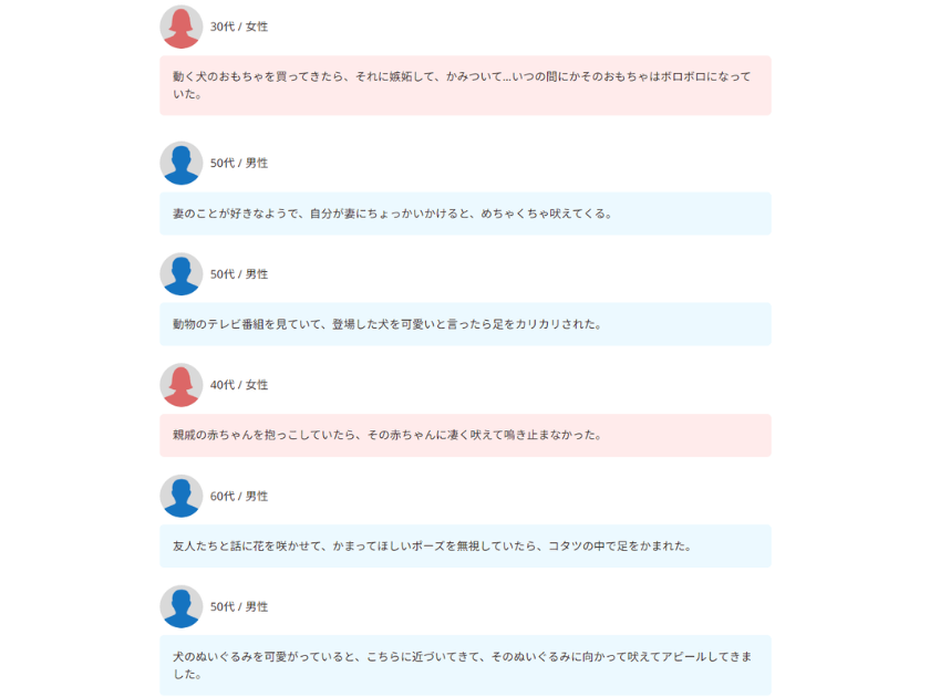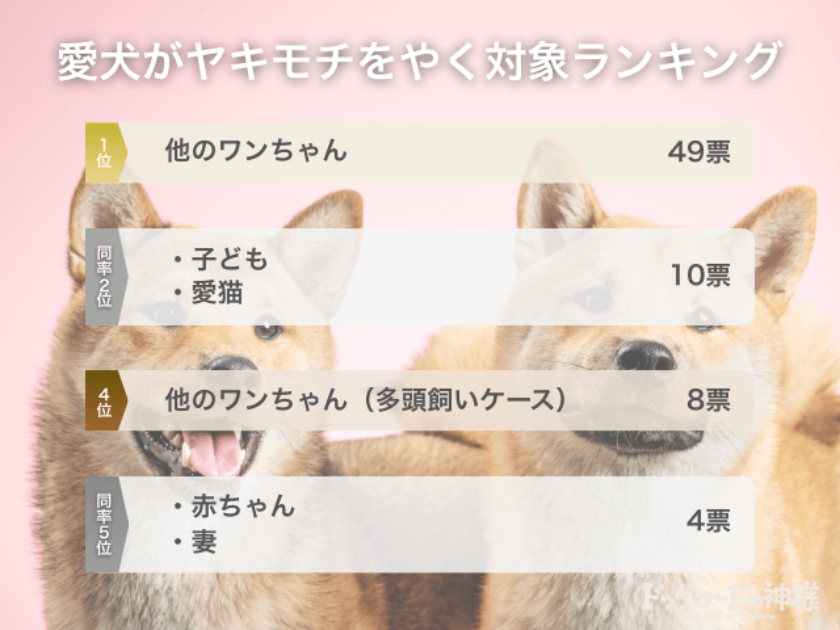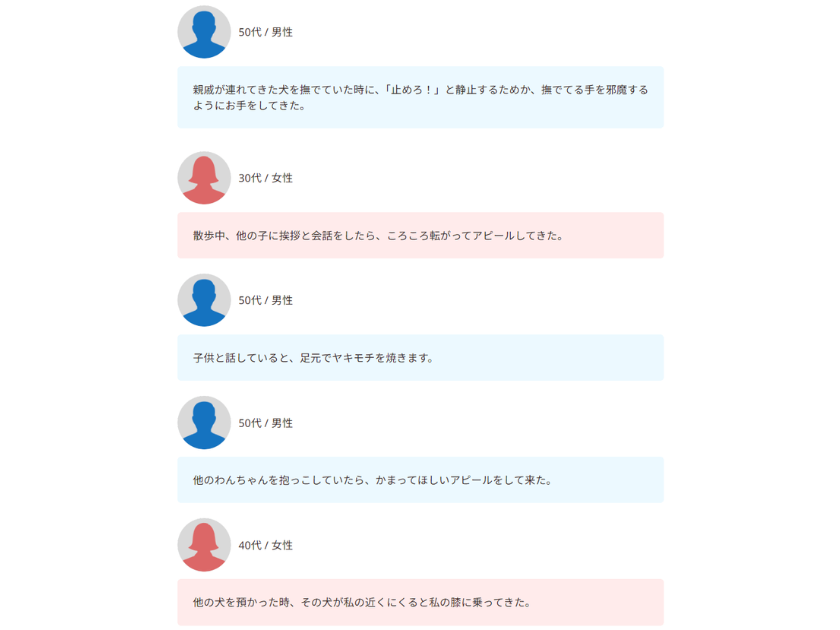 そのほか「子ども」や「猫」といった家庭内の存在も上位にランクイン。身近な家族こそライバルになりやすいようです。さらにユニークなのは「妻」という回答。飼い主本人を取られたと感じるのか、特定の人間に対して嫉妬心を見せるケースもありました。