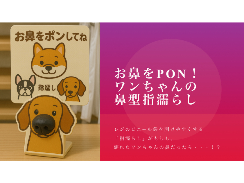 そこで、思いついたのが、オレンジ色のピンポン玉の部分を犬の鼻のデザインにする事。レジのビニール袋を開けやすくする「指濡らし」がもしも、濡れたワンちゃんの鼻だったら…!?