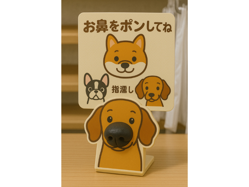 • レジ横や袋詰め台に小型の犬の顔プレートとして設置。