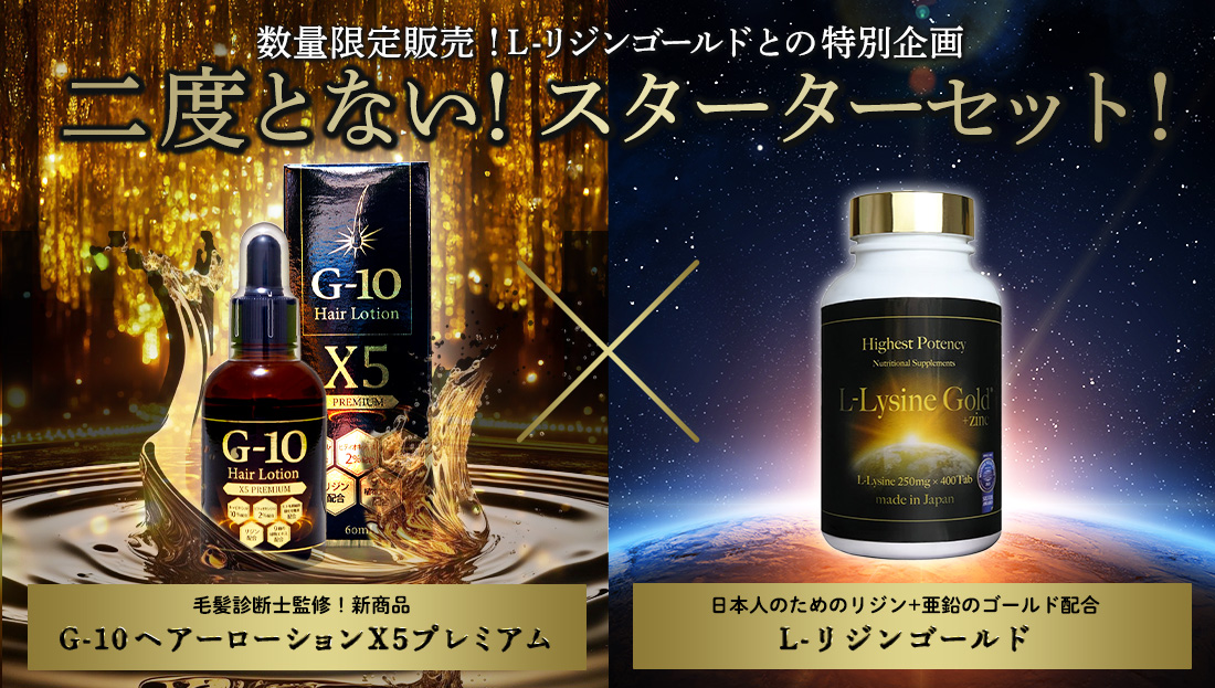 本気で始める方へ!内側と外側から徹底アプローチ! 最新の頭皮科学を結集したG-10ヘアローションX5プレミアムと、サポート成分Lリジンゴールドを組み合わせた特別スターターセットをご用意しました。