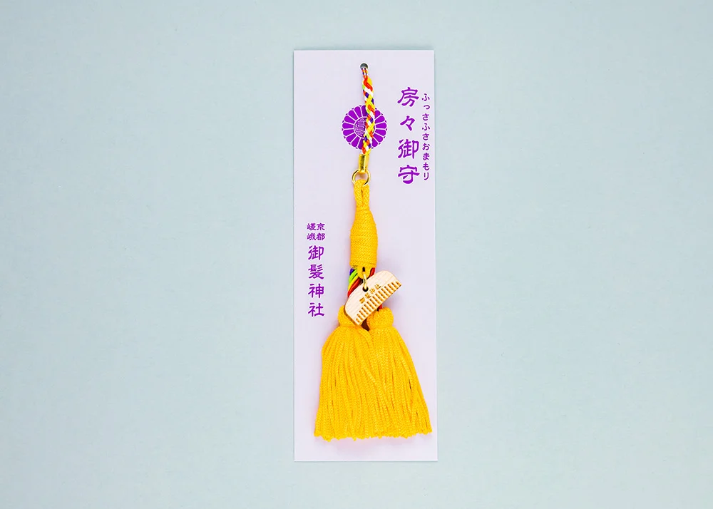 小さな櫛のモチーフと、髪の毛に見立てた房がゆらゆらと揺れるユニークなお守りです。
